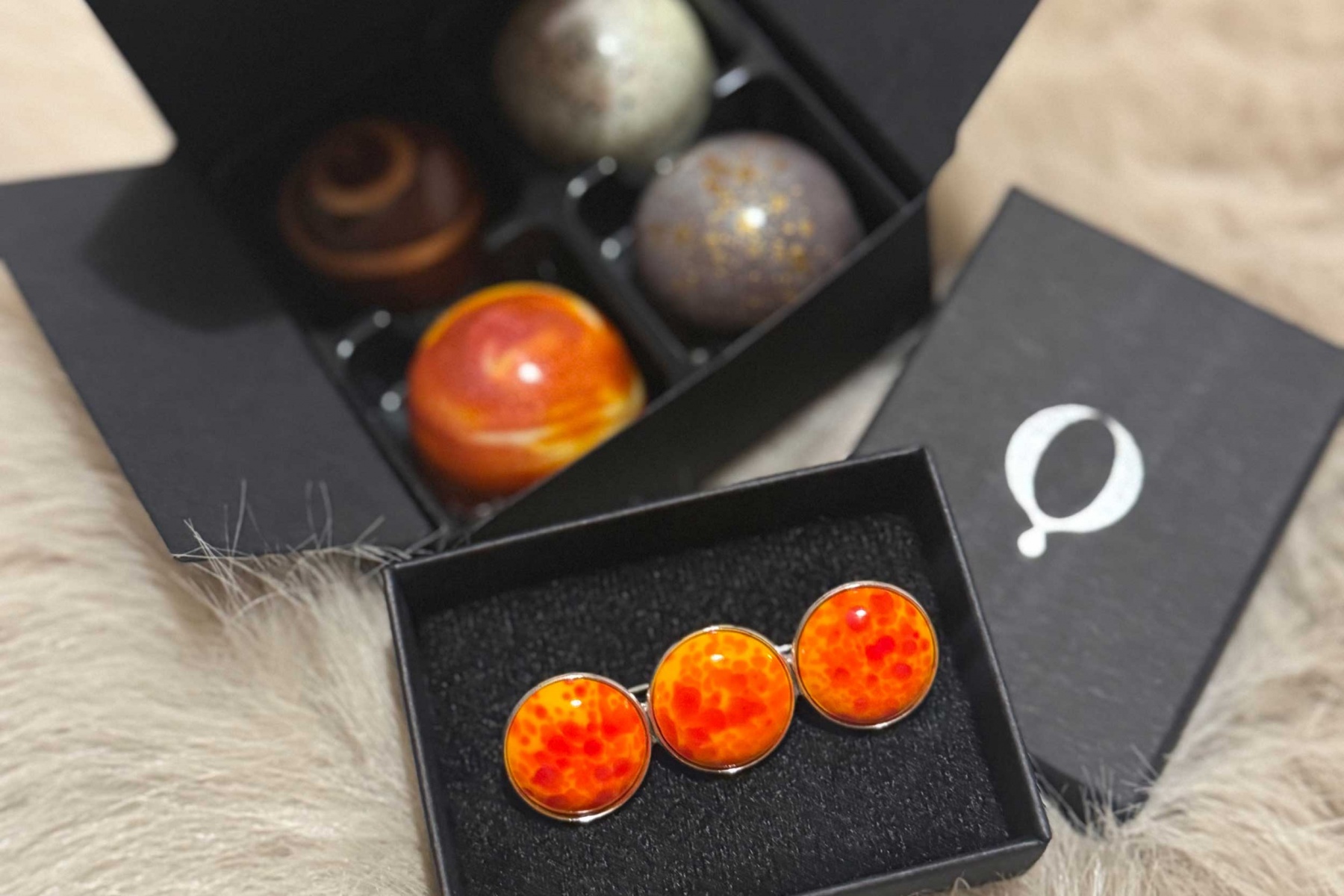 Kdysi jsme v Jablonci nad Nisou otevřeli Q Burger bar, který se rychle stal oblíbeným místem gurmánů. A právě zákazníci burger baru nás přivedli k myšlence nabídnout i něco sladkého. Dorty byly příliš objemné, klasická čokoláda zase příliš obyčejná. Jako rodáci z města s bohatou tradicí bižuterie jsme si položili otázku: proč nespojit umění našich předků s čokoládou? Proč by čokoláda nemohla vypadat jako skleněný šperk? A tak vznikly pralinky, které svým designem vzdávají hold jabloneckým skleněným perličkám.